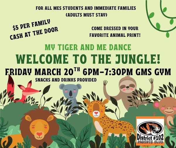 This year's MES My Tiger and Me Dance theme is Welcome to the Jungle! Come dressed in your favorite animal print and choose your mask at the door. There will be dancing, snacks and drinks, and pictures. $5 per family, cash at the door. Friday March 20th 6pm-7:30pm in the GMS gym. Adults must stay during the event. ![]()