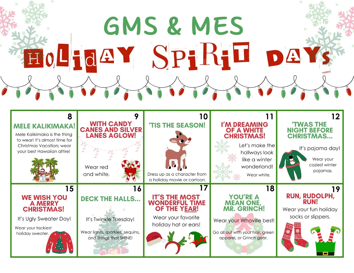 Student Council's holiday spirit days begin next Monday. We invite all GMS students and staff to participate in two fun-filled weeks of *holly jolly* spirit days!