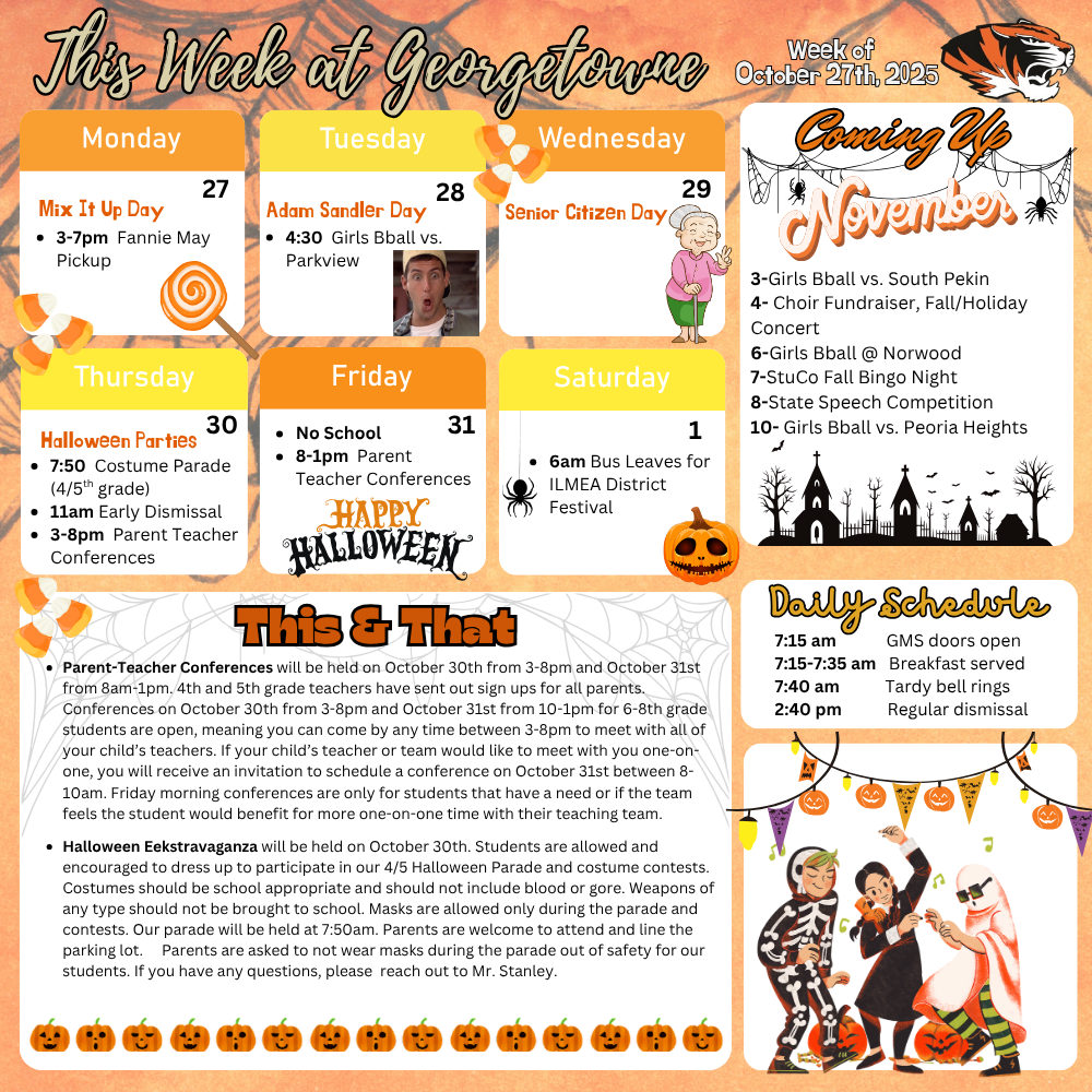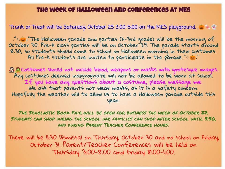 It is a BIG and BUSY week in District 102! Below you will find info for Halloween celebrations and P/T Conferences for both MES and GMS. We can't wait so see your creative costumes and meet with parents to kick off a wonderful Halloween weekend!
